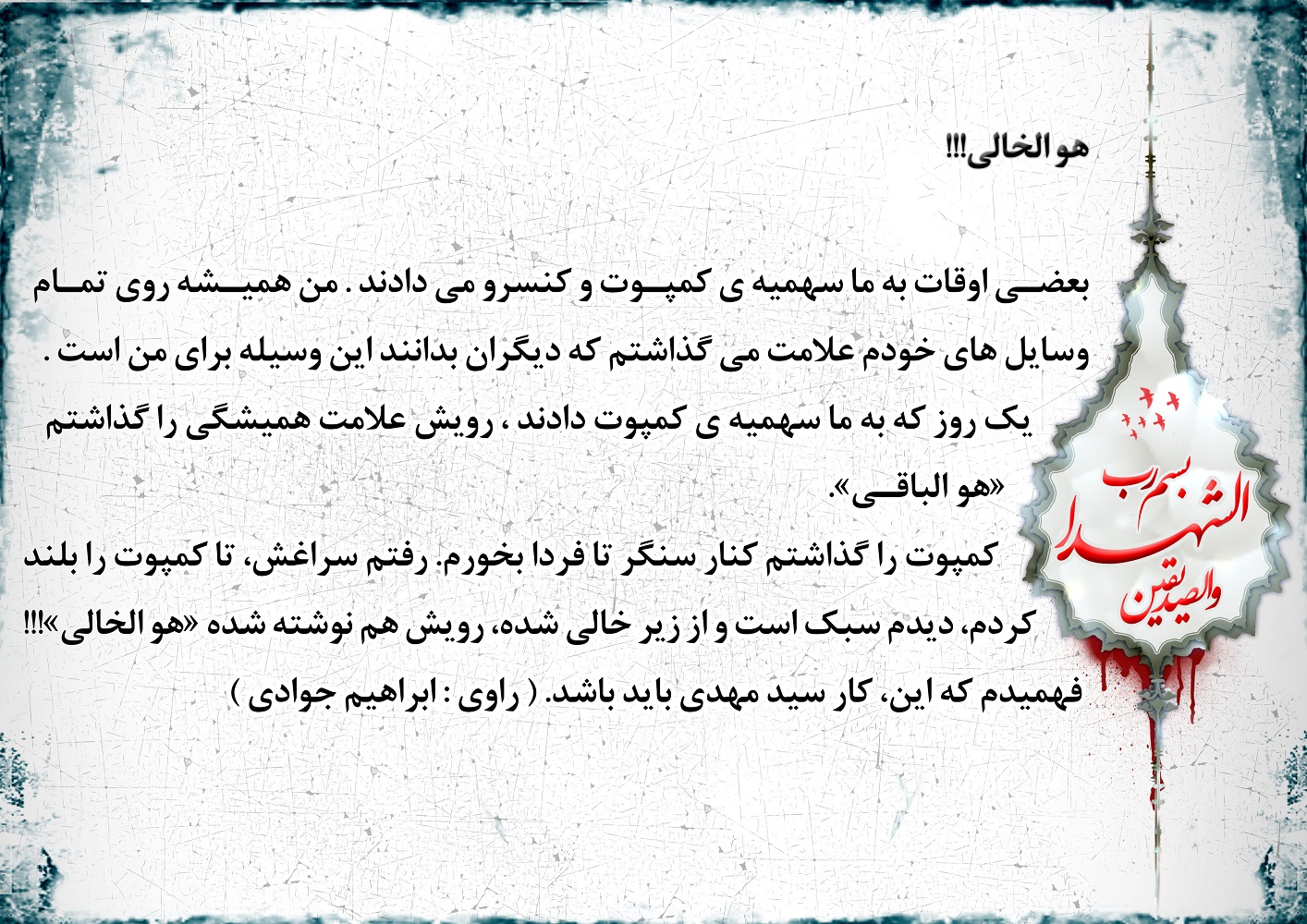 قول داد پیداکنه بیاره رفت شلمچه و شروع کرد گریه زاری بالای یک کانال وقت برگشت گفت: شهدا! داریم کاروان می بریم مشهد. 13تاجاهم خالی داریم هرکی میاد بسم الله...