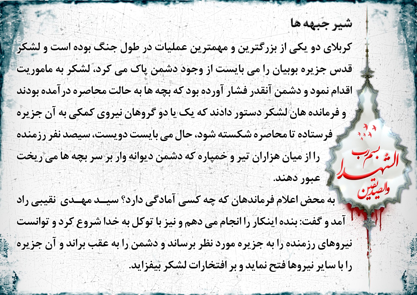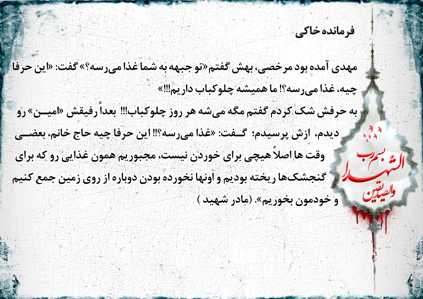 از بچه های گردان تفحص بود. کاروان هزارتایی شهدا رو عازم مشهد کرده بود 13 تا پیکر شهید کم داشتند. گفتن هرجور شده باید پیدا کنید وبیارید.
